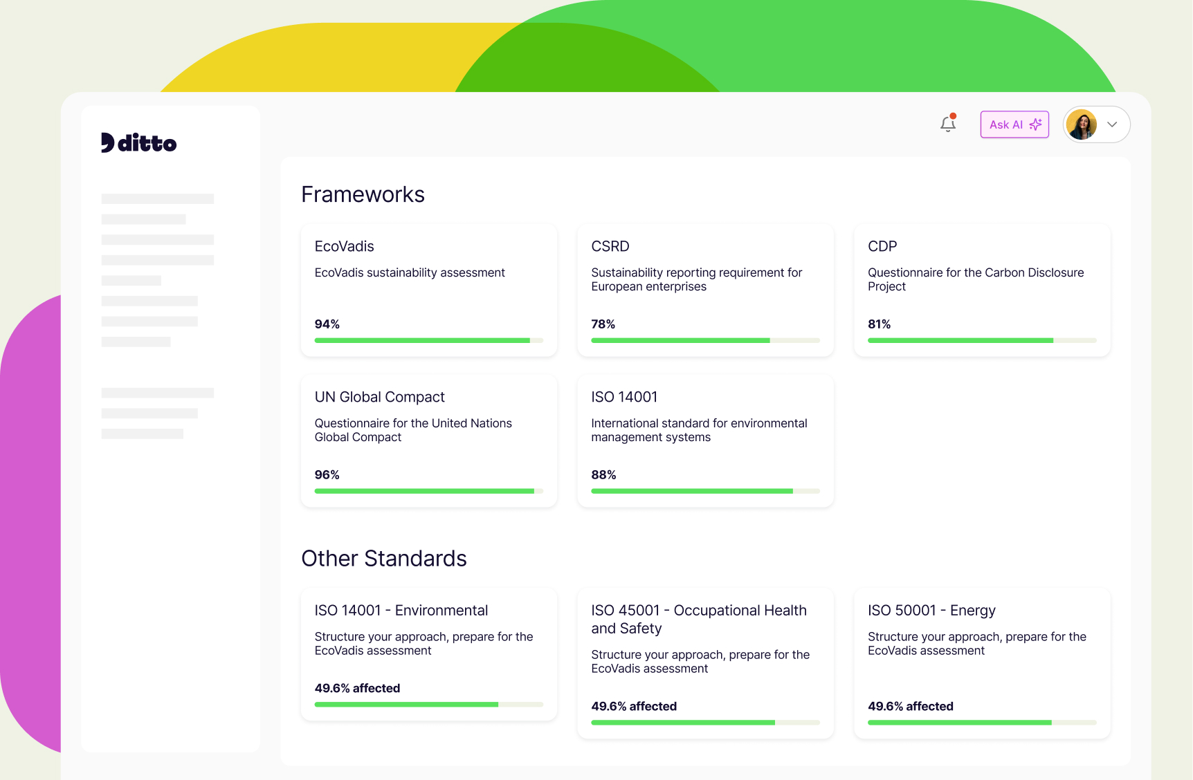 Ditto helps you level up your CSR practices and meet your partner requirements across frameworks like EcoVadis, ISO, CSRD, and CDP.